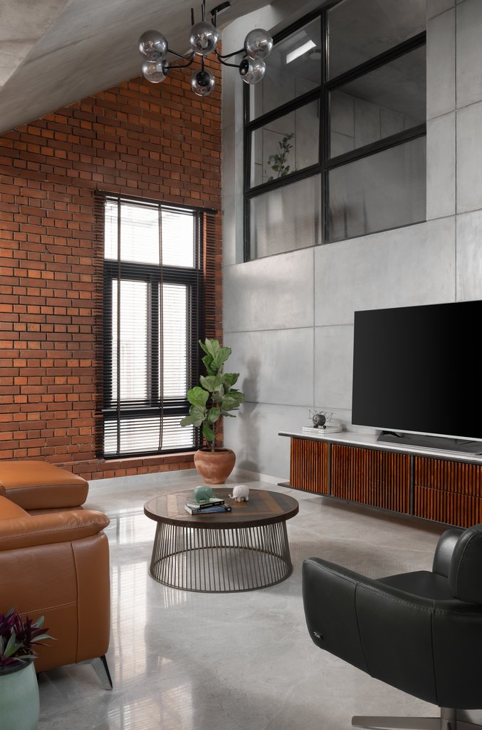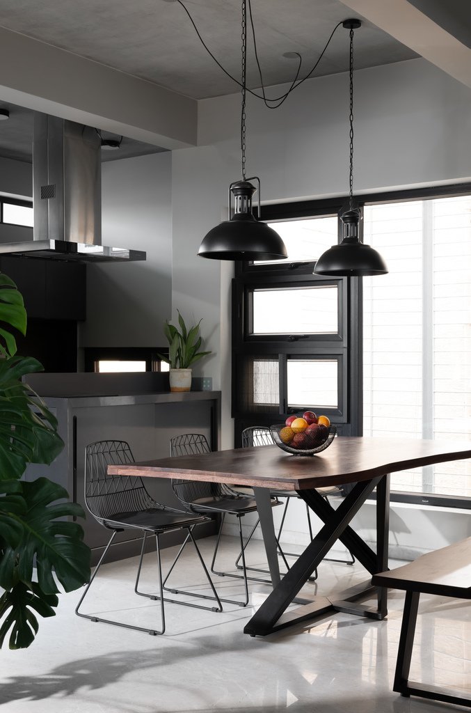 This practical solution to the façade not only met environmental requirements but also informed the building’s overall aesthetic. The industrial language, initiated with the metal louver system, flows seamlessly into the interiors of each apartment. The use of exposed concrete, metal sections, and wood further reinforces the cohesive industrial style, creating a balance between raw materiality and comfort.