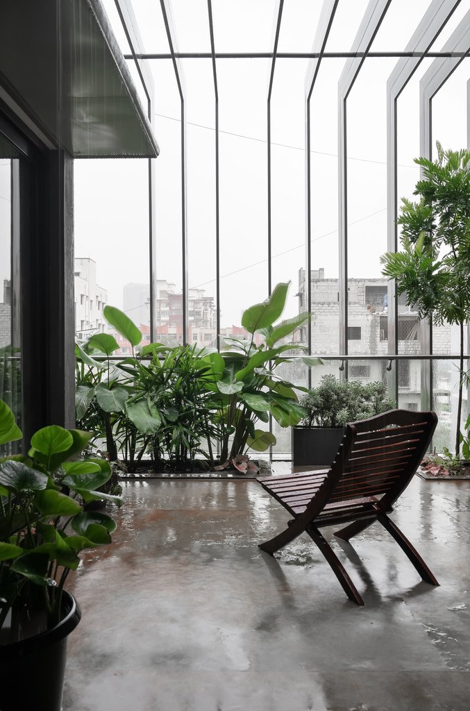 The topmost apartment, designed with one less bedroom than the other units, allowed us to incorporate a small, private courtyard. This courtyard is shaded by the same metal louvers that define the building’s front façade and roof, offering a shaded outdoor space.