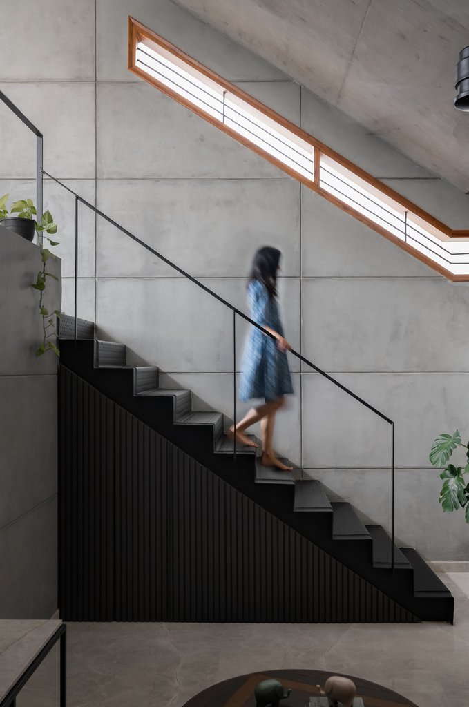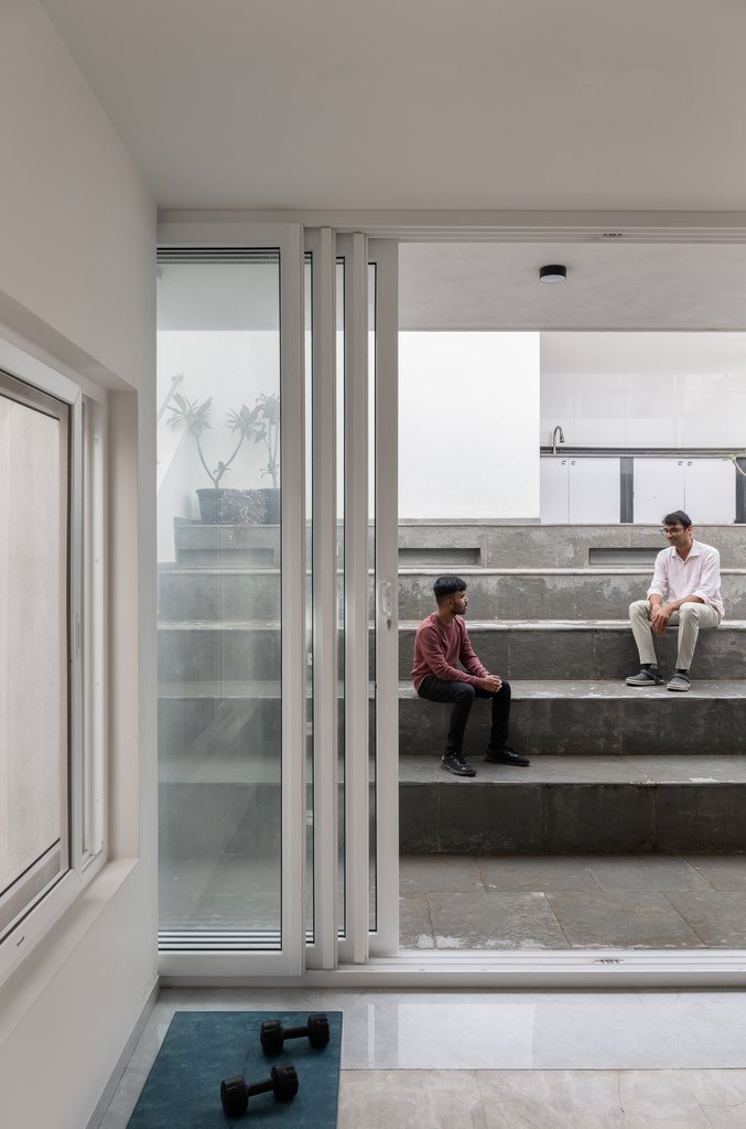 To achieve this, we adopted a split-level concept for each apartment, taking advantage of the lower height required for the car parking. This allowed for the two street-facing bedrooms to be positioned closer to the ground, creating a more intimate relationship with the street. The separation of living areas across levels created distinct zones within each home, enhancing a sense of individual identity, a quality typically associated with standalone houses. The two upper apartments followed a similar split-level configuration, which led to the creation of a shared amenity space at the roof level including an amphitheater which took advantage of the split level. This would double up as a family gathering space to screen movies and other shared activities. Other communal facilities include a gym, pool table, laundry and a guest room, shared by all three apartments. The split-level design helped conceal this communal floor from view, ensuring the building maintained a low, approachable profile.